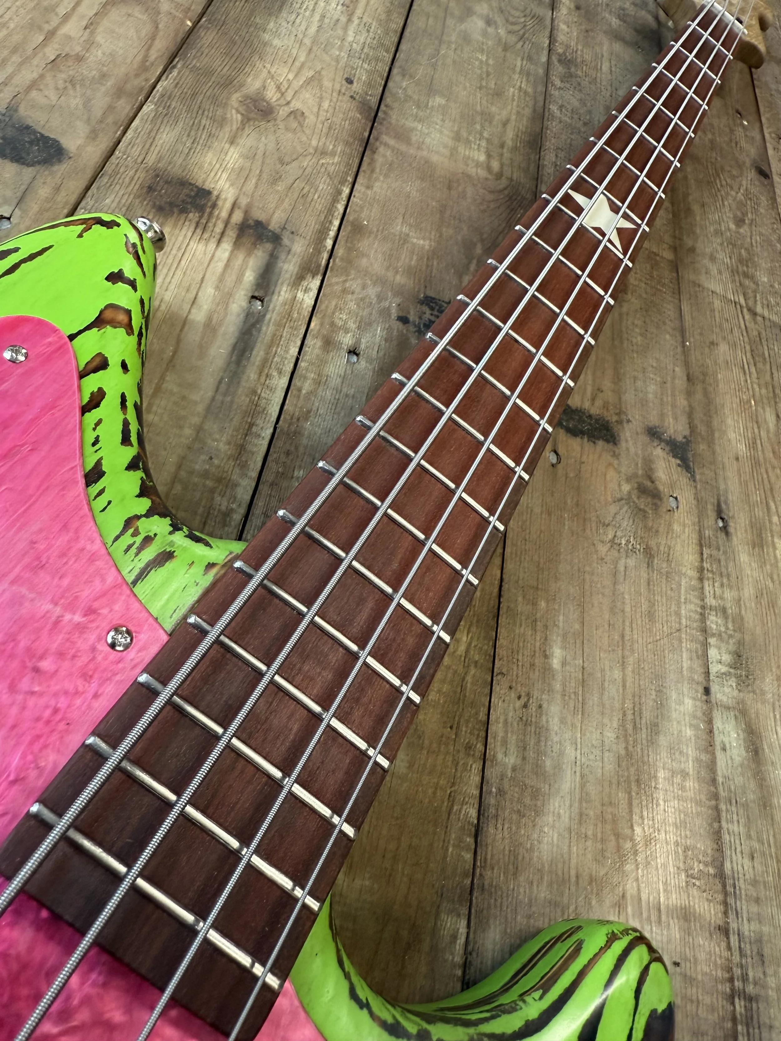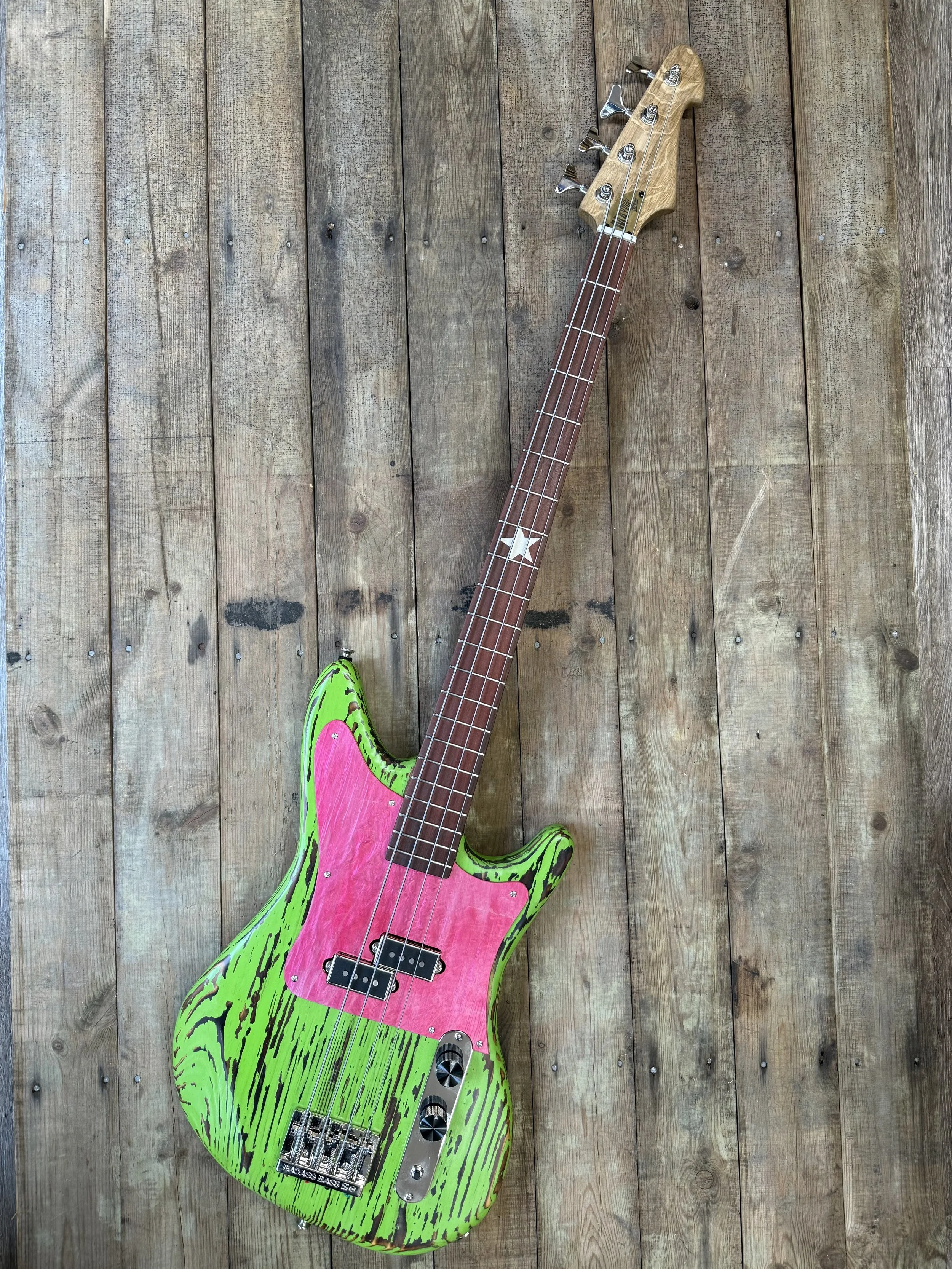 Based on our signature Meloca body shape, this bass features a bold neon green chalk paint finish paired with a pink and white marbled acrylic pickguard for an unmistakable visual statement.