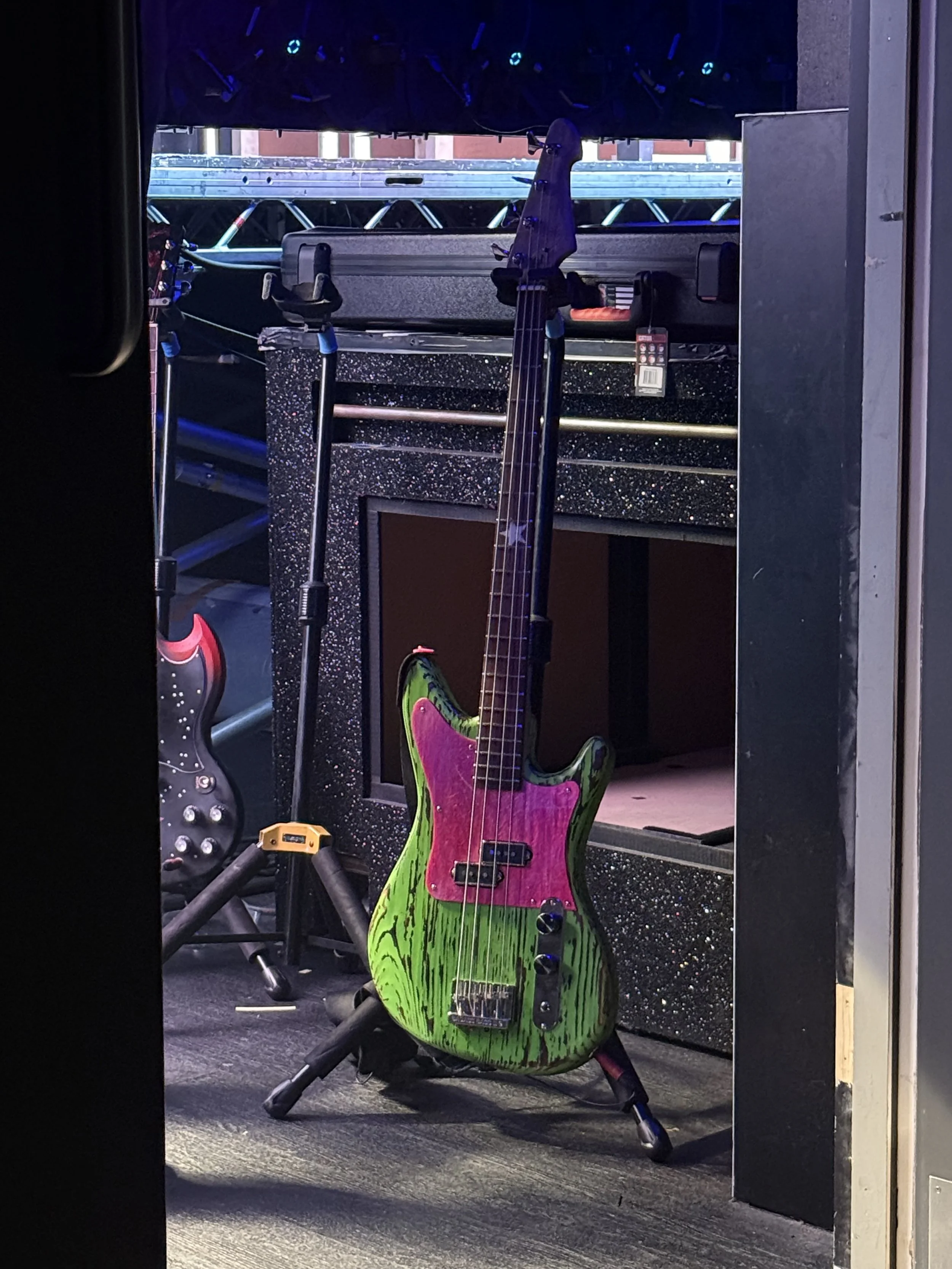 Under the hood, itβs fitted with a custom Mojo reversed split-coil pickup, crafted specifically for this build and featuring nickel open-top covers. The result is a punchy, articulate tone that cuts effortlessly through the mix. The electronics include CTS potentiometers, cloth-covered wiring, and an Orange Drop capacitor, with the addition of a kill switch to allow Calum to mute the bass easily when switching between bass and keys.