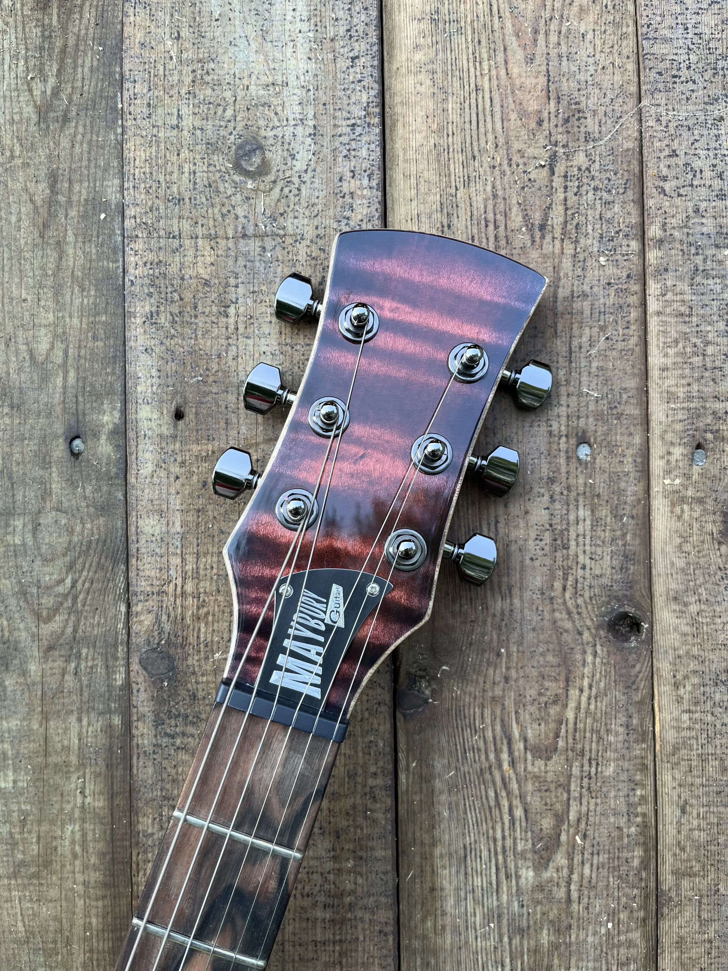 From the very first glance, the wood choices make a statement: a 5A flamed maple top and matching maple neck, paired with a two-piece swamp ash body, and finished with an absolutely striking piece of figured Mun ebony for the fretboard.