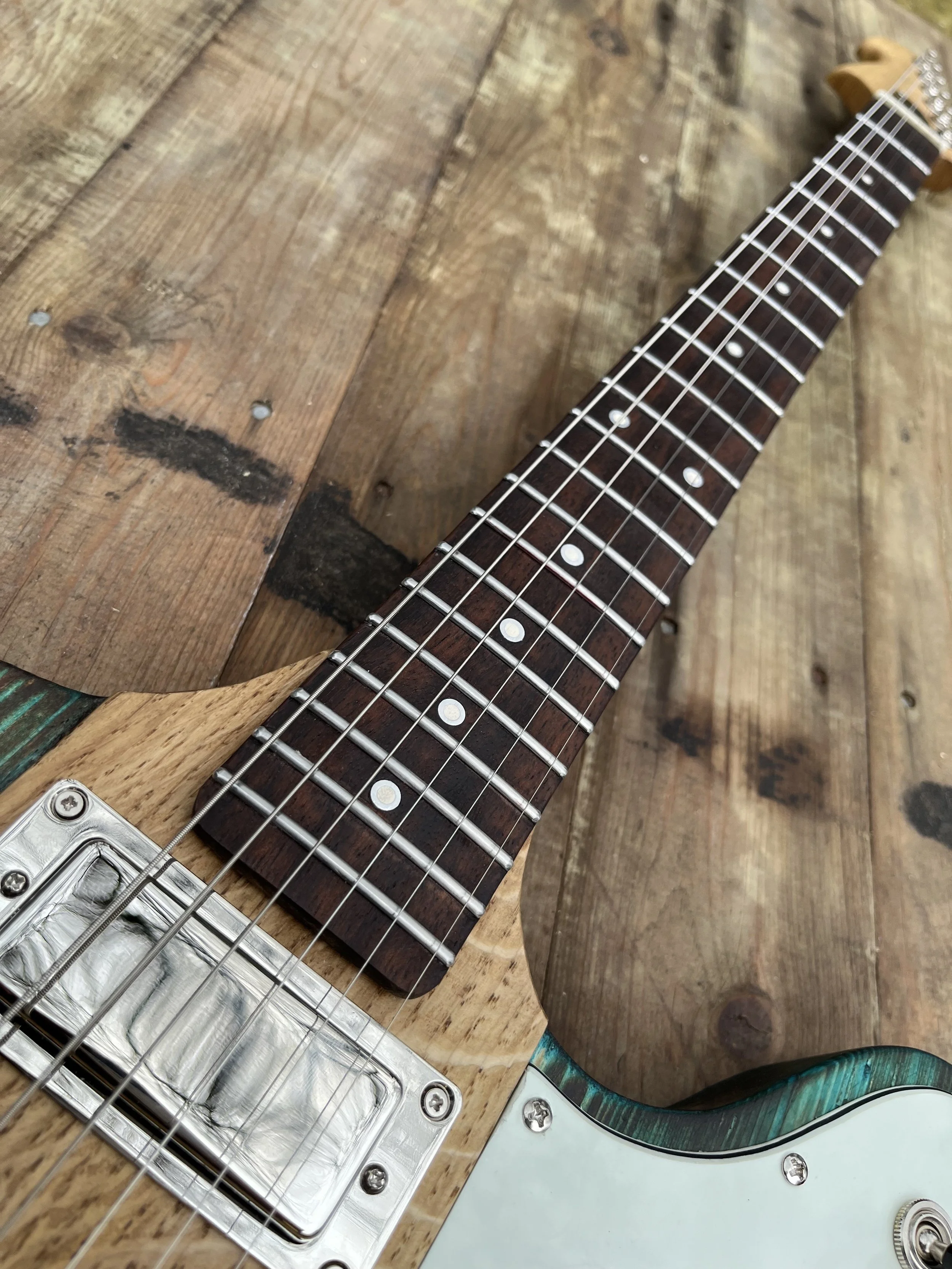 The result is a masterpiece: a Strat-inspired 25.5” scale reverse headstock neck made from figured Oak, with a smooth Indian Blackwood fretboard. This neck is comfortably paired to the body with a deluxe-style bolt-on plate and a contoured heel for enhanced playability.