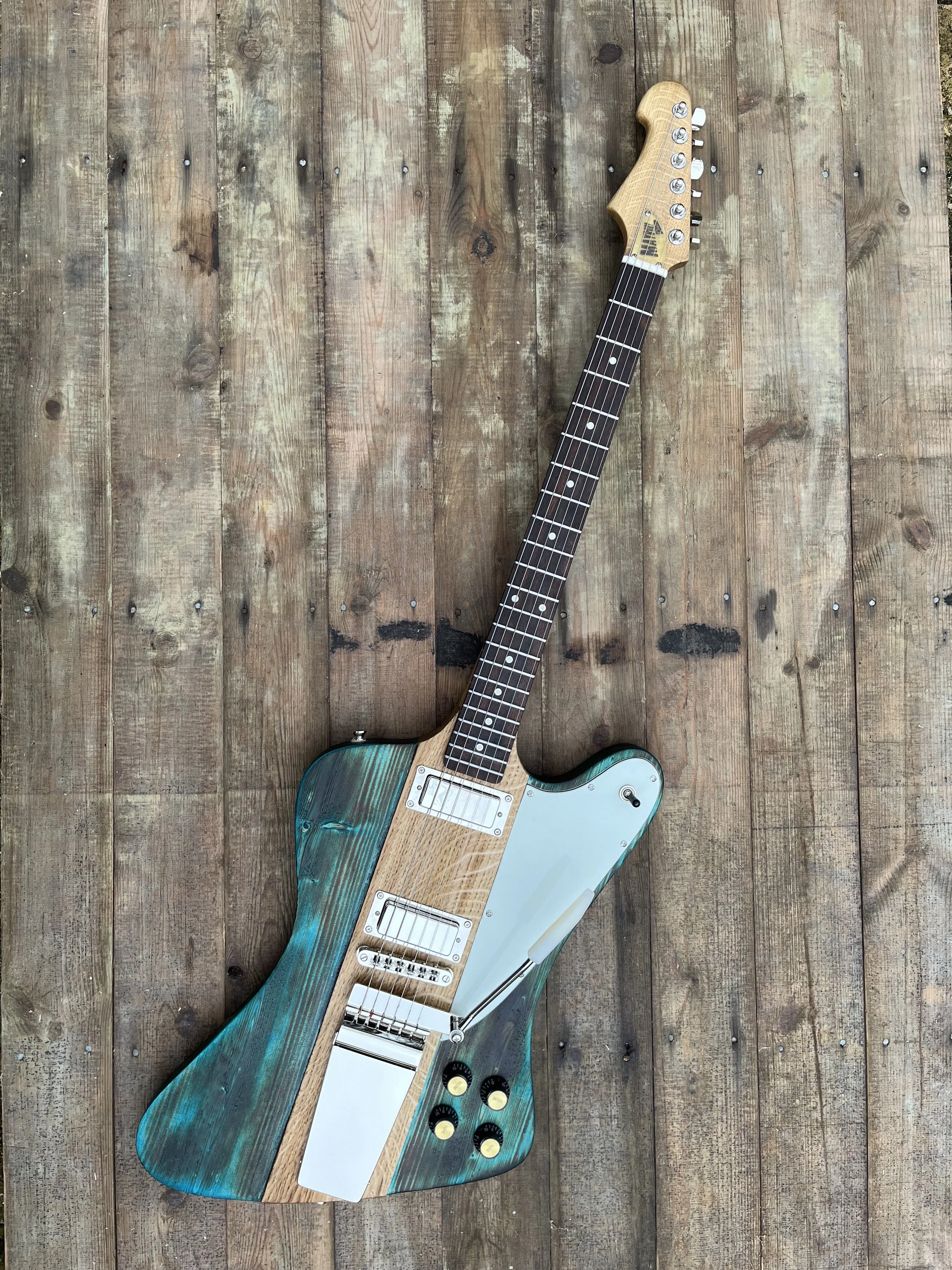 The body is a traditional Firebird shape, featuring a natural figured Oak center, complemented by Teal-dyed Shu Sugi Ban Spruce wings. The Teal finish matches Kit’s first signature build, providing a cohesive look across his instruments.