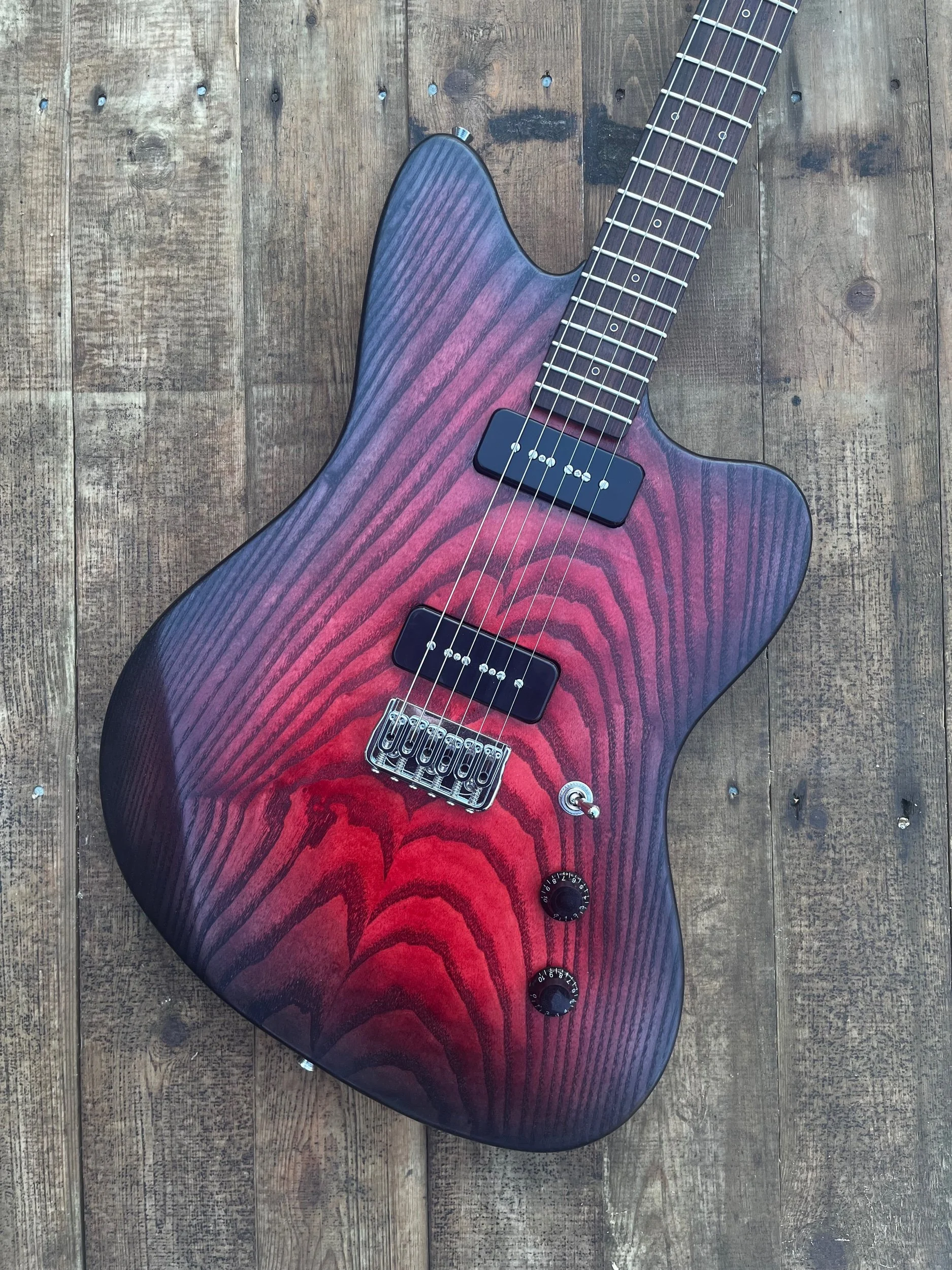 Jason built me an Upscaler to my requirement; S-type Fishhook, twin P-90s, locking tuners, red shoi sugi ban finish.
