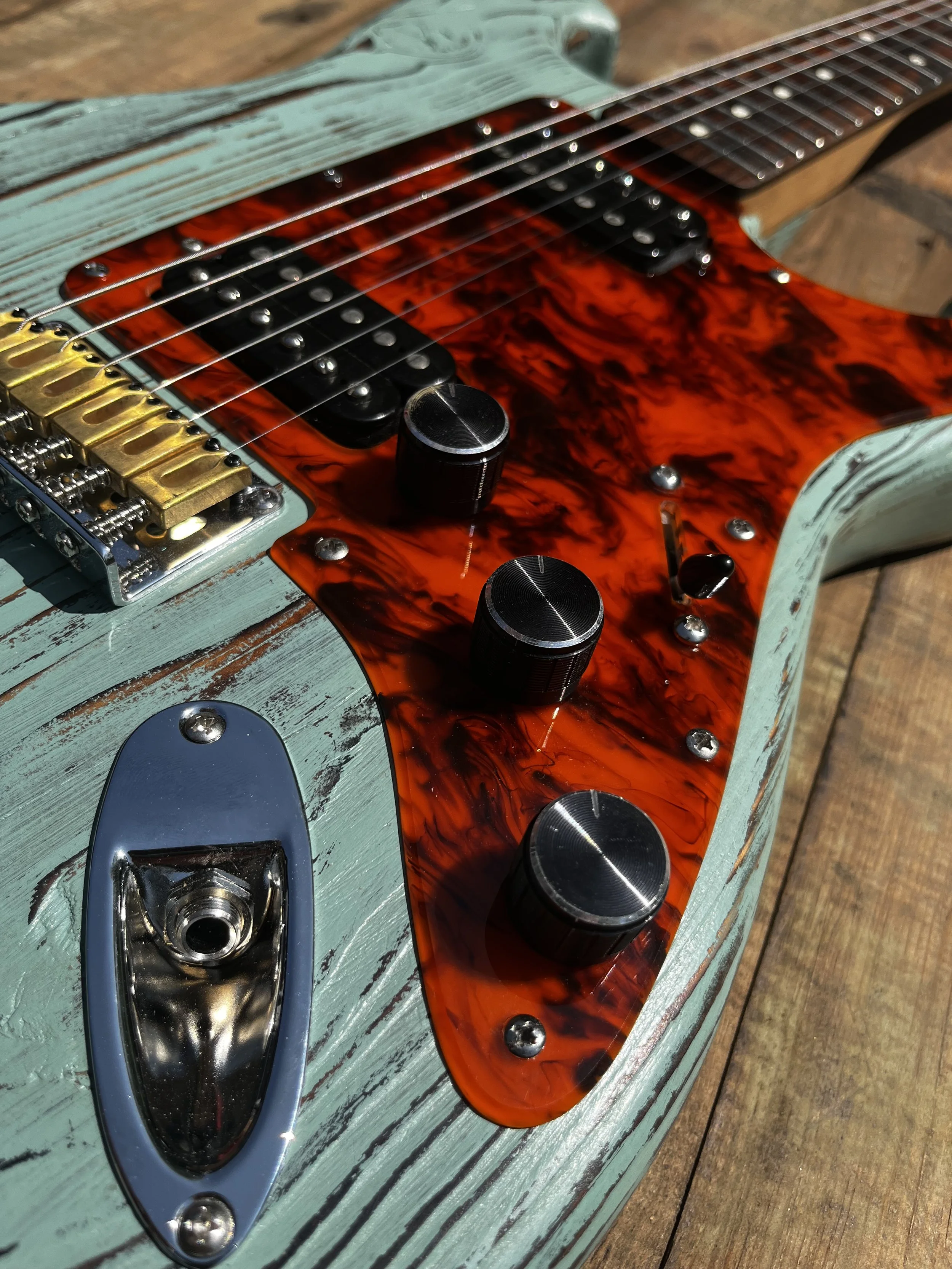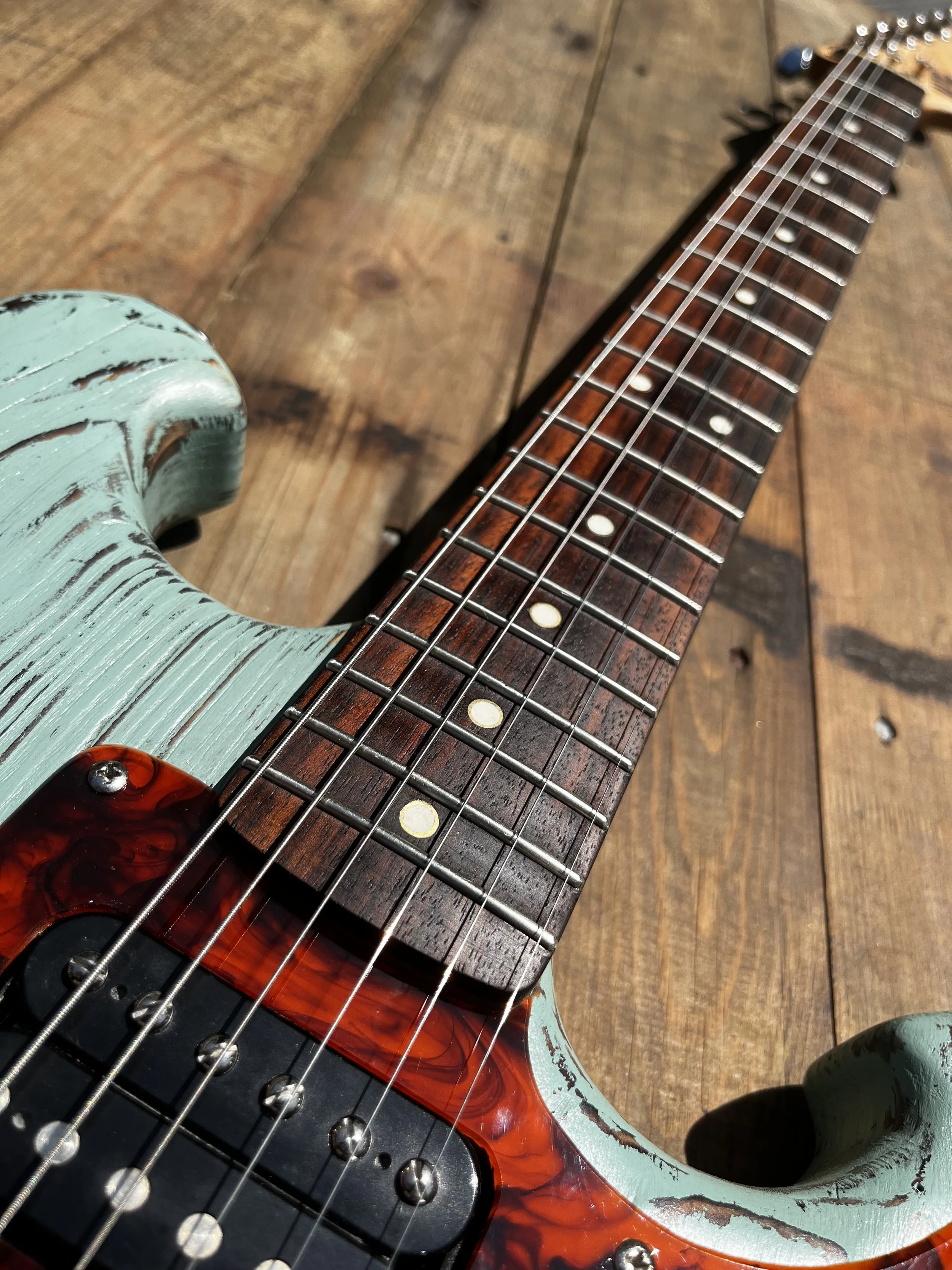 The result is an instant classic featuring a stunning teal green chalk paint finish, double humbuckers, and a translucent acrylic tortoise shell pickguard.