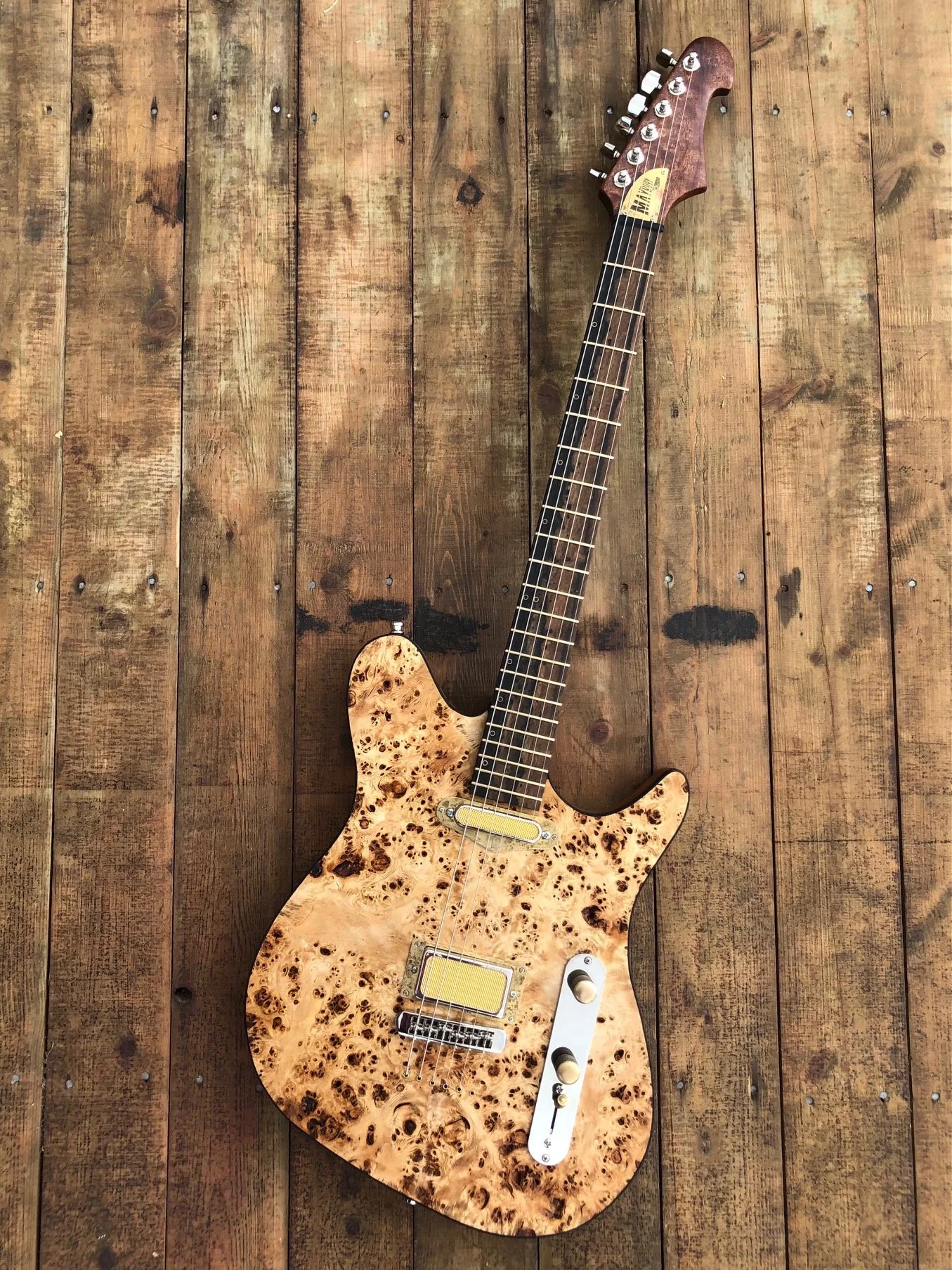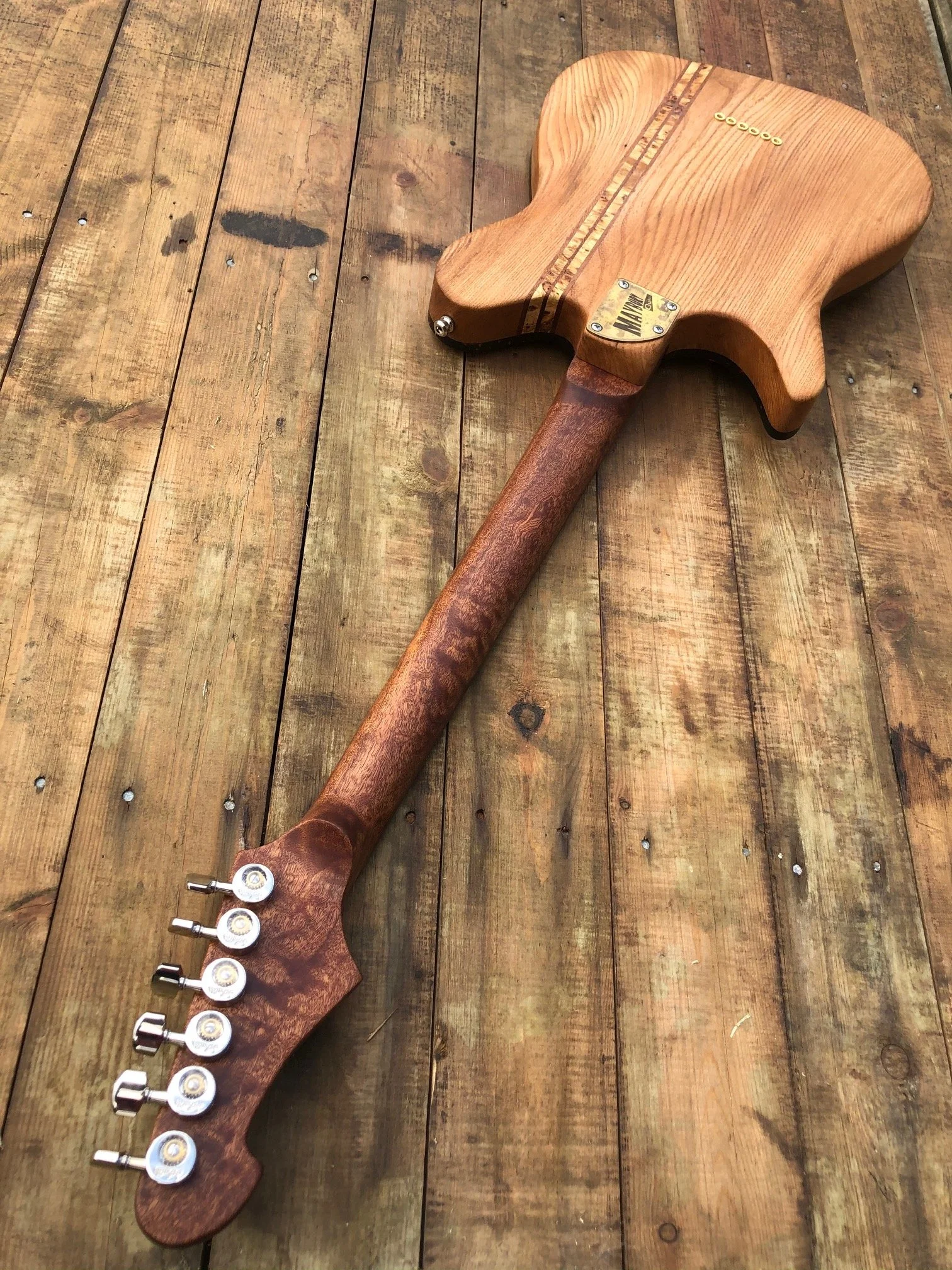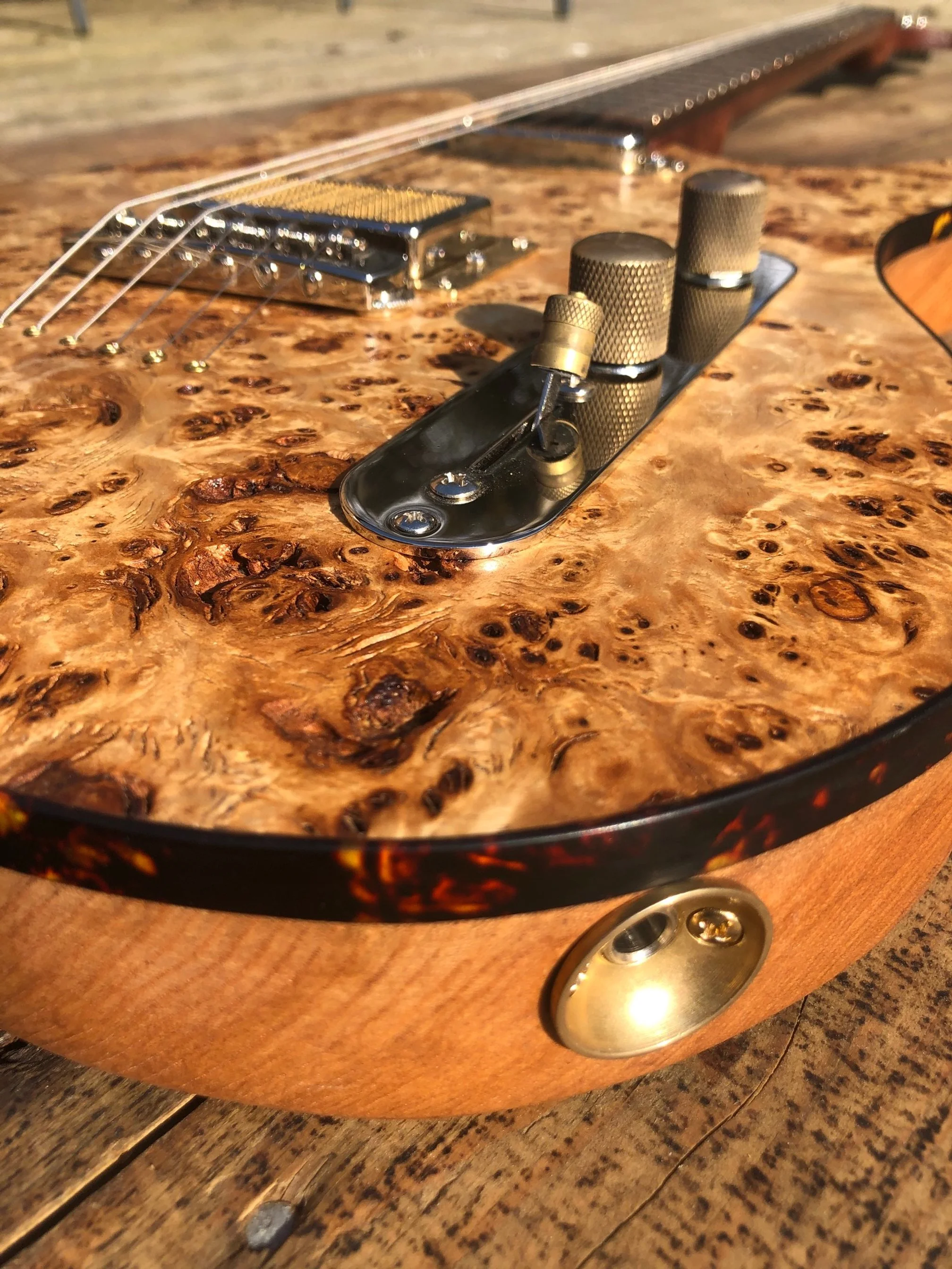 The body is carved with a semi hollow chamber and is made from a beautifully grained piece of Elm with Sapele and Burl Poplar racing stripes. The body is capped off with a book matched Poplar Burl top dressed with a complimentary tortoise shell binding.