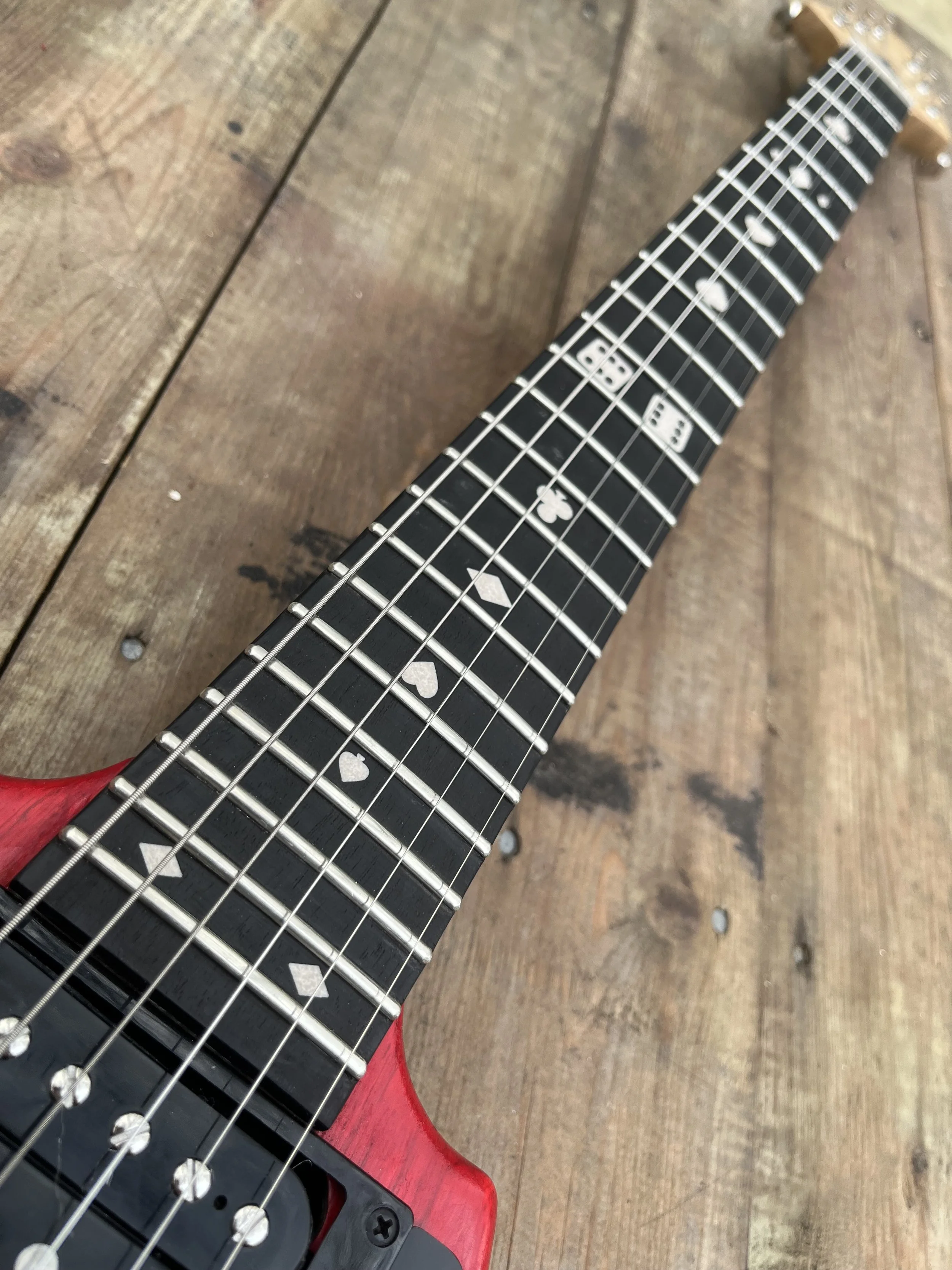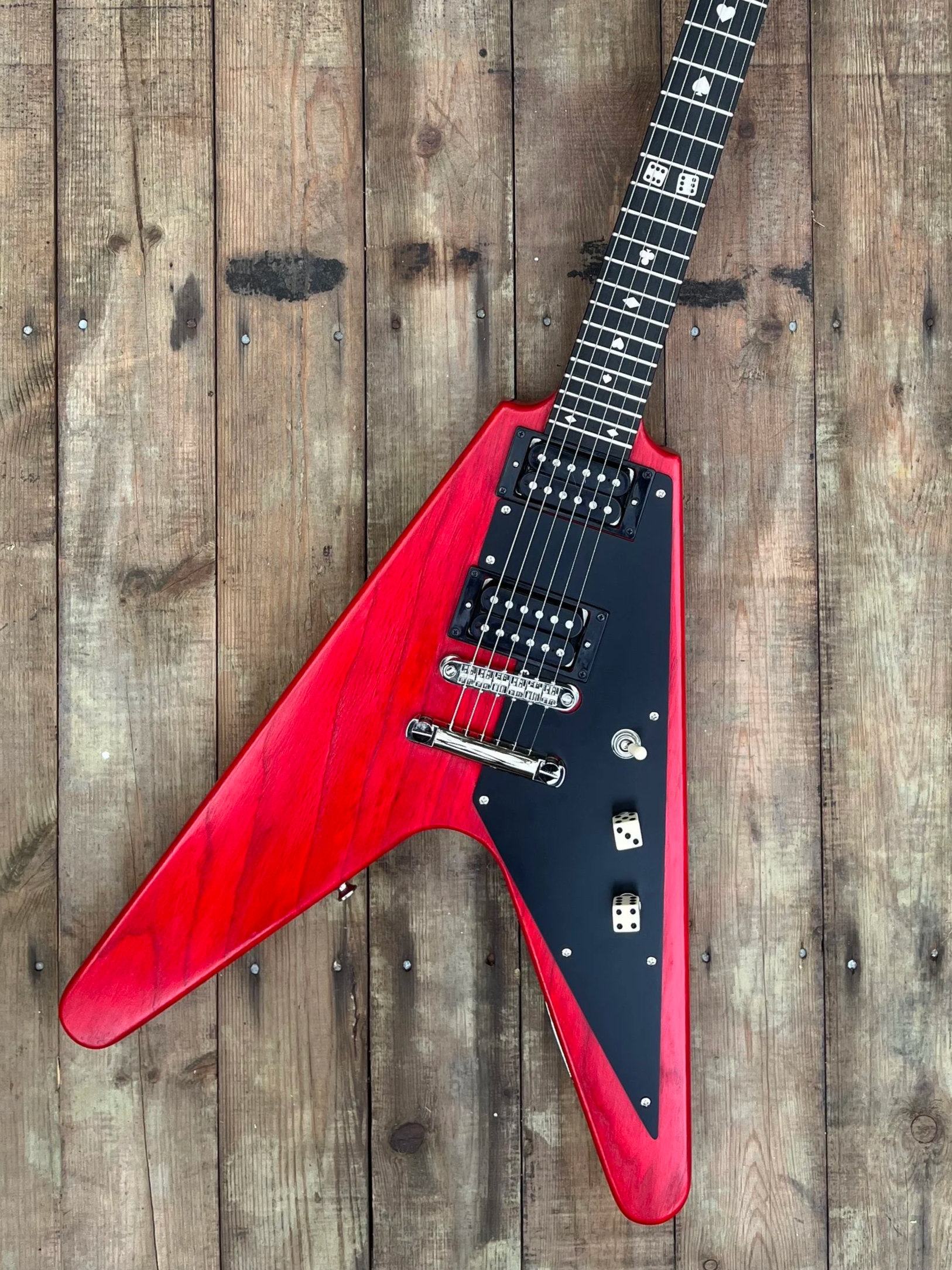 The flamed maple neck is a striking contrast, paired with a 24.75β ebony fretboard, 24 medium jumbo frets, and custom inlays inspired by the thrill of the gamecard suits and a double-six set of dice at the 12th fret. The theme continues with cream dice control knobs, adding a playful yet refined touch.
