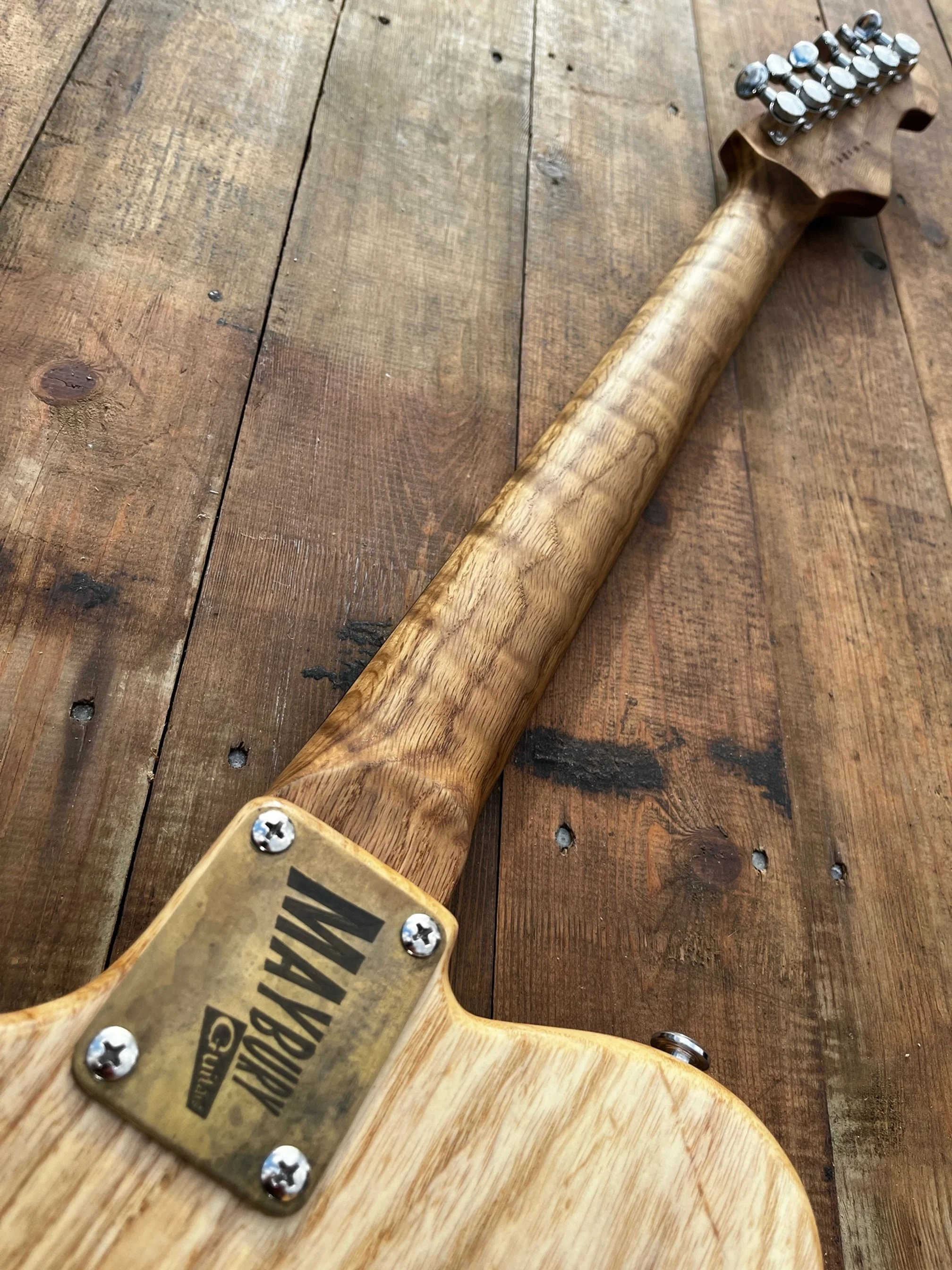 The specs continue with an exquisite figured white oak neck paired with a Munn Ebony fretboard, featuring aluminum and terracotta-colored inlays that add a unique touch.