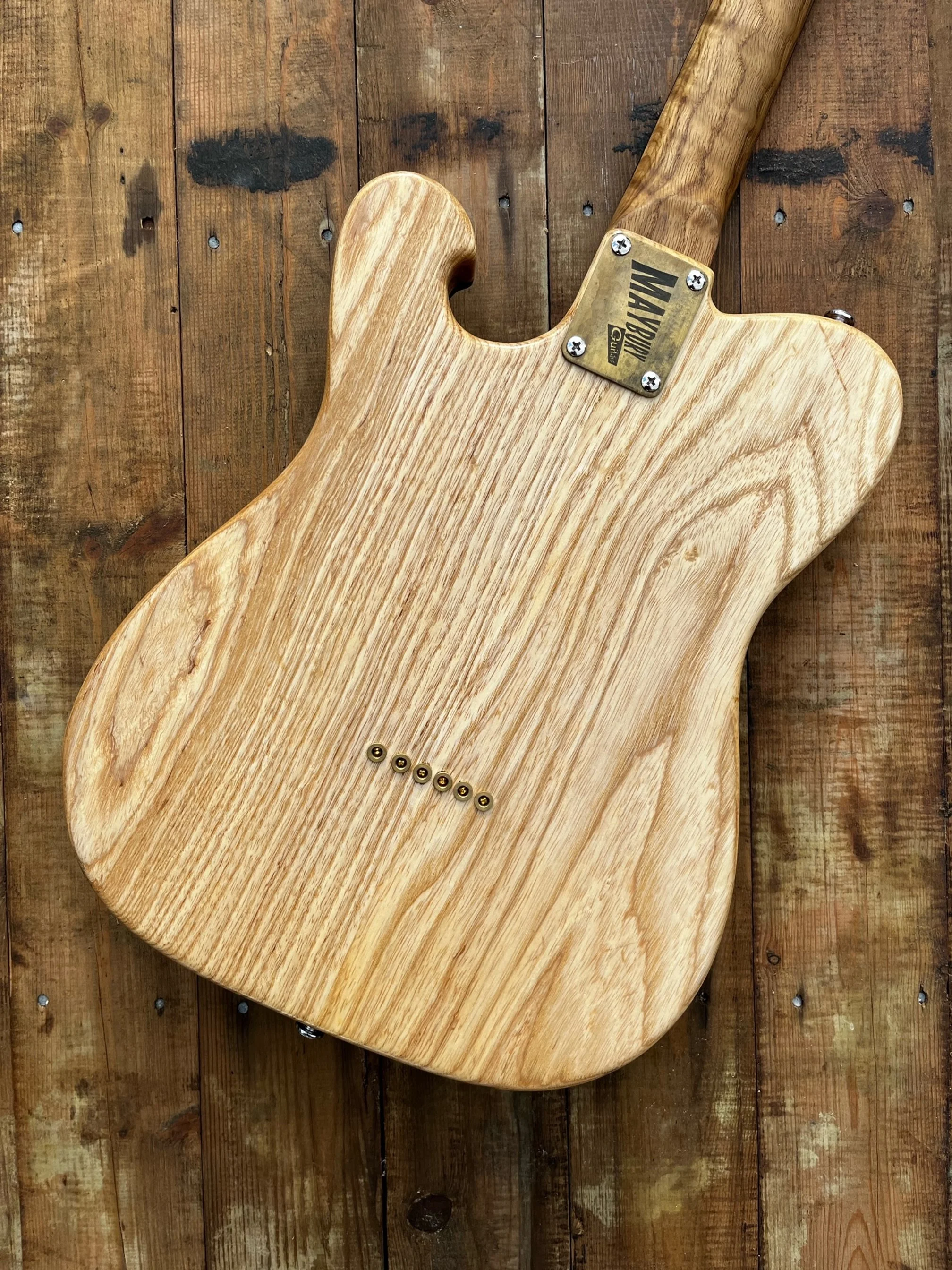 The chrome hardware includes a sideless Tele bridge and locking tuners, complemented by aged brass knobs, a switch tip, and a custom Maybury neck plate.