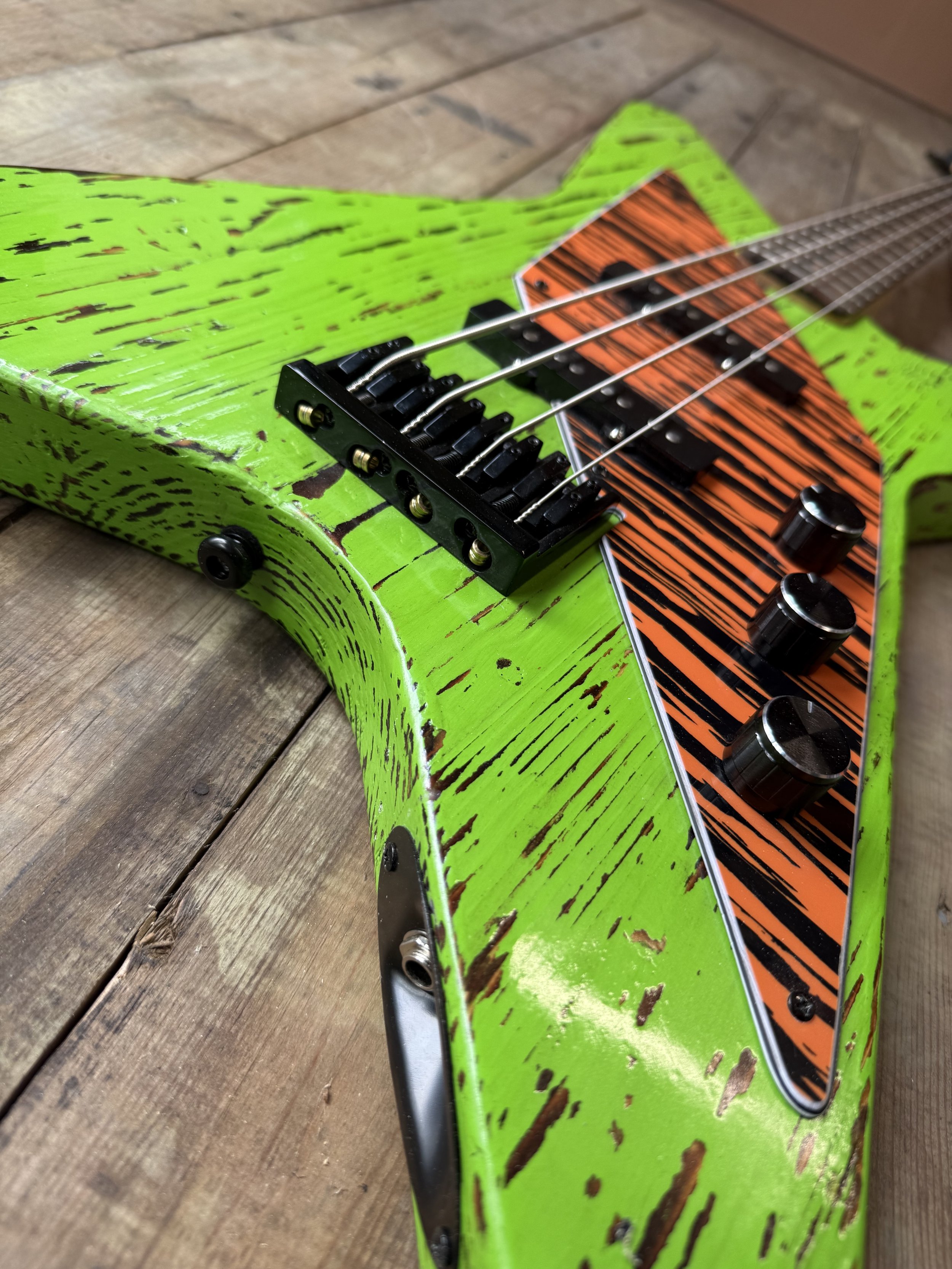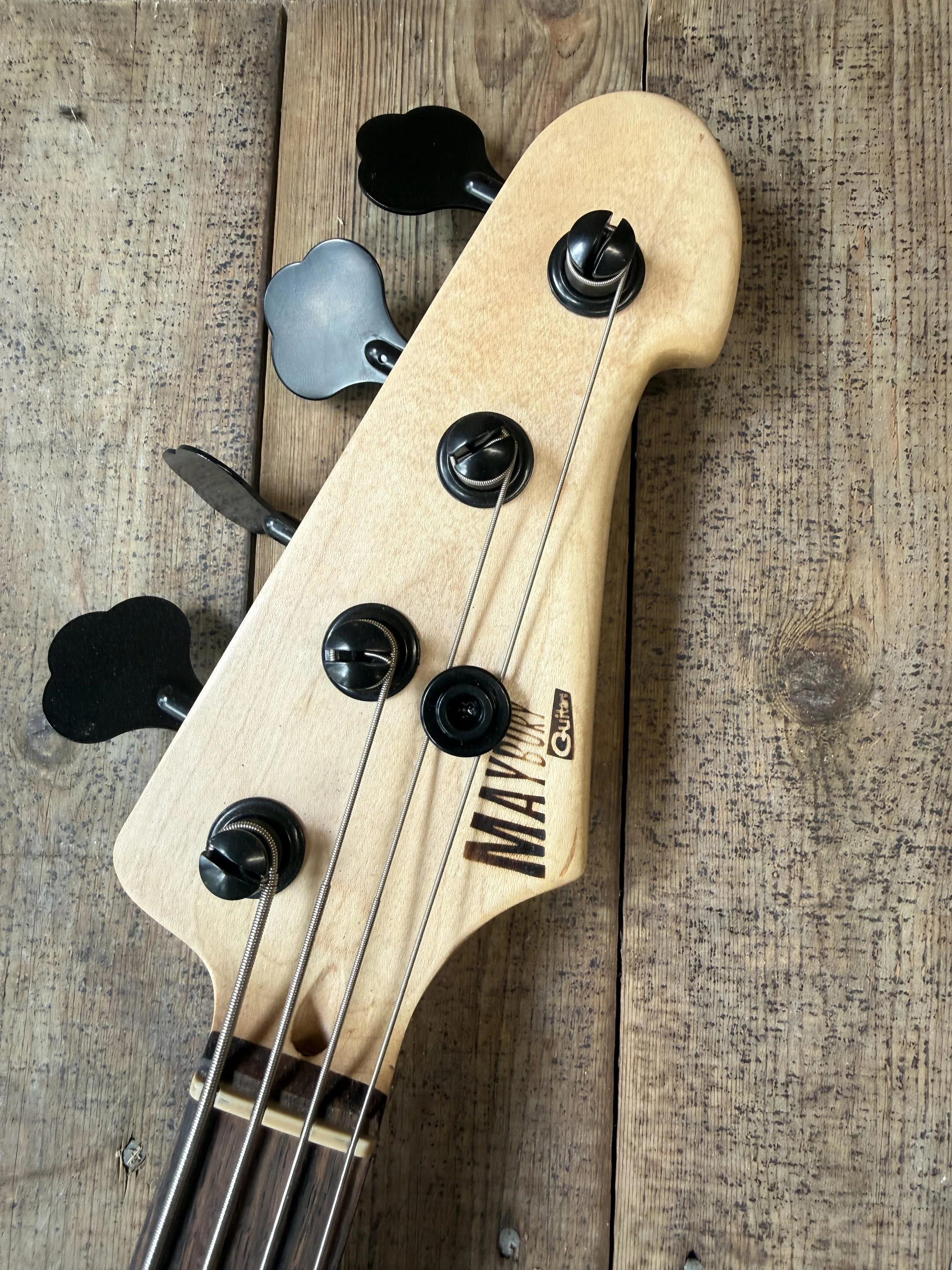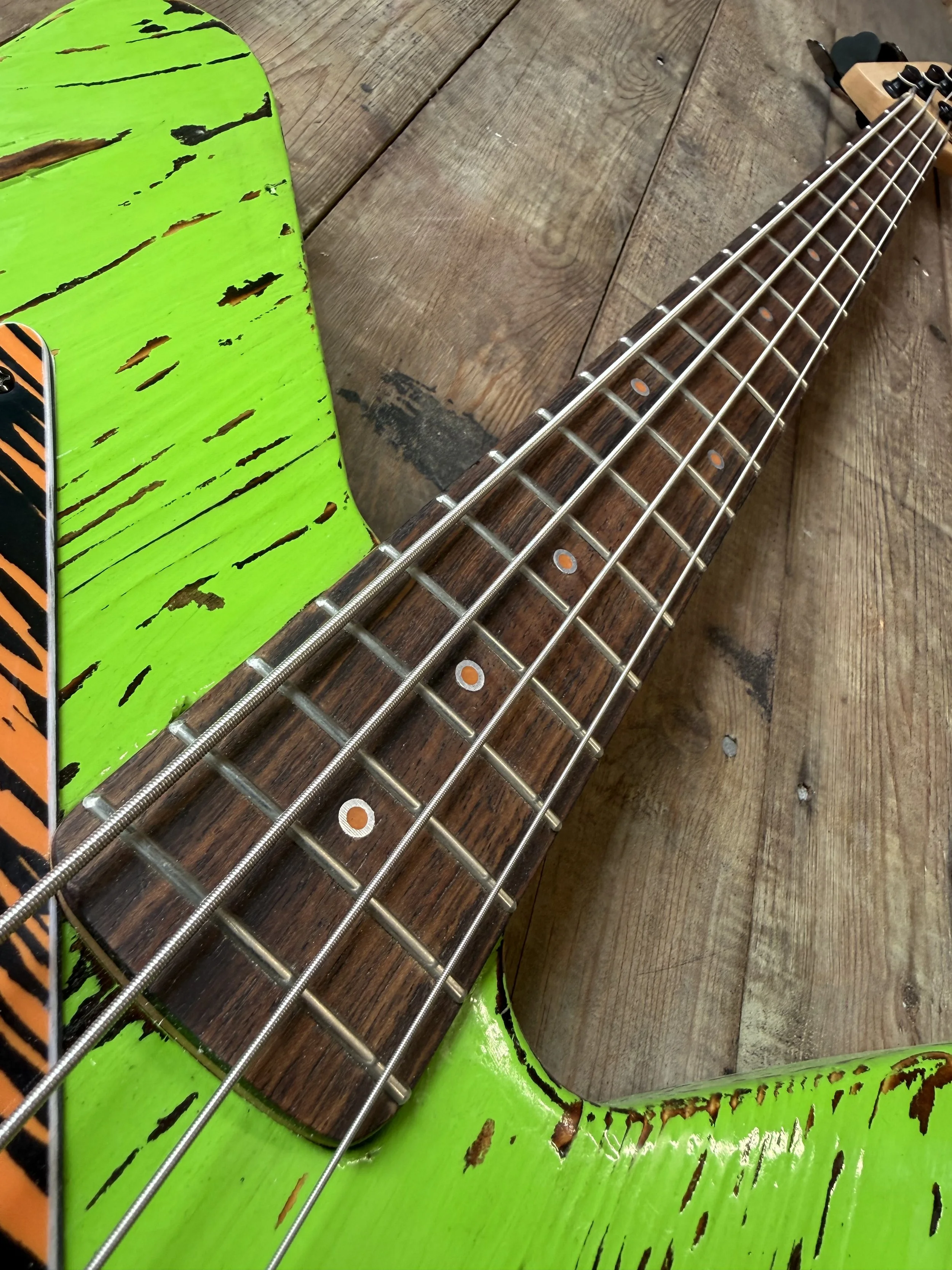 Sporting a refinshed 2019 Squire Jazz bass neck, in Maple and Rosewood, that been stripped, reshaped and treated with a smooth polymer‑oil finish. The 20 Nickel Jumbo frets have undergone extensive fretwork and the origianl fret markers have been replaced with Aluminum and orange resin ones. This offers a sturdy, confident feel that matches the Vibe of the reclaimed timber body perfectly.