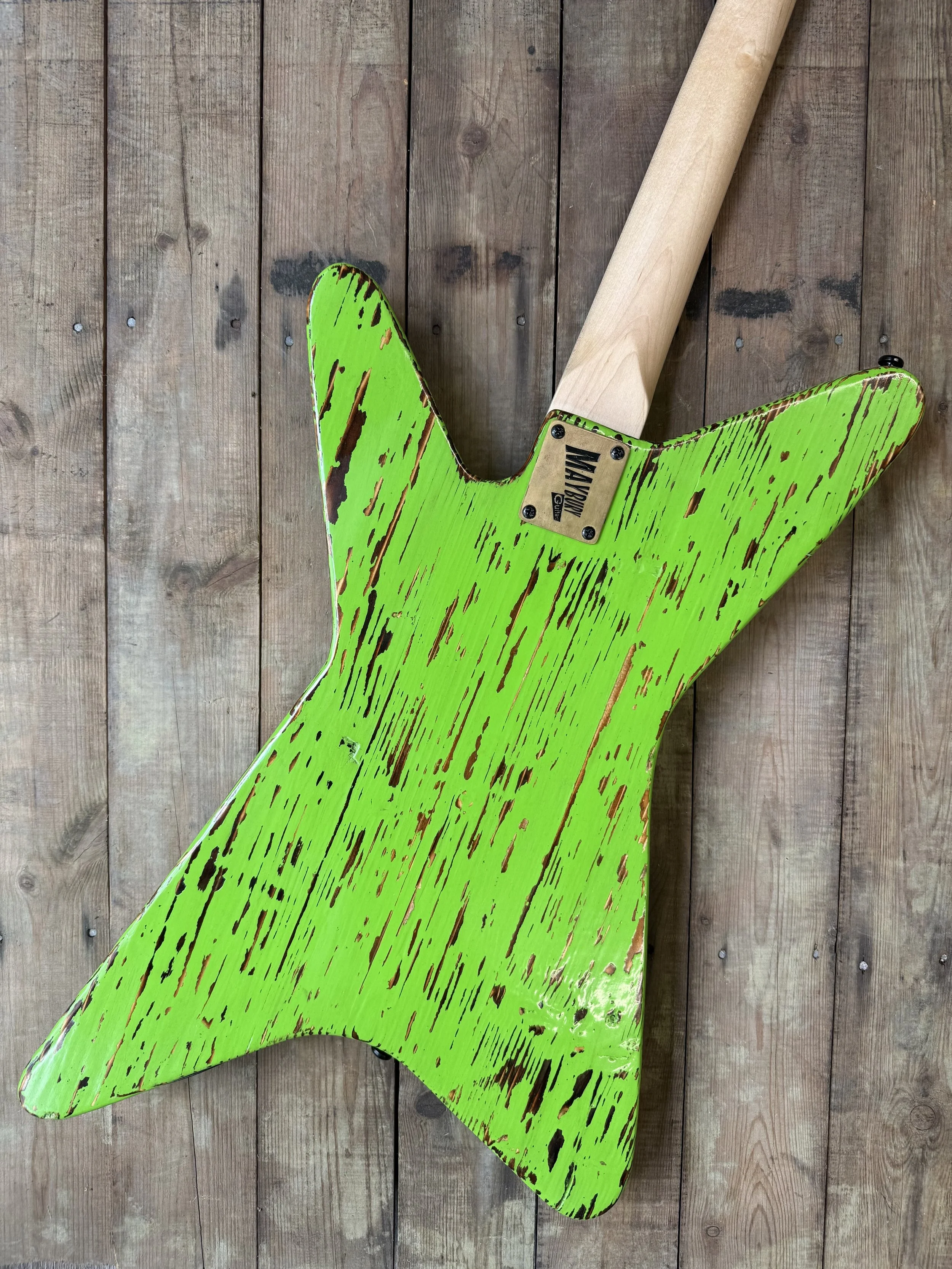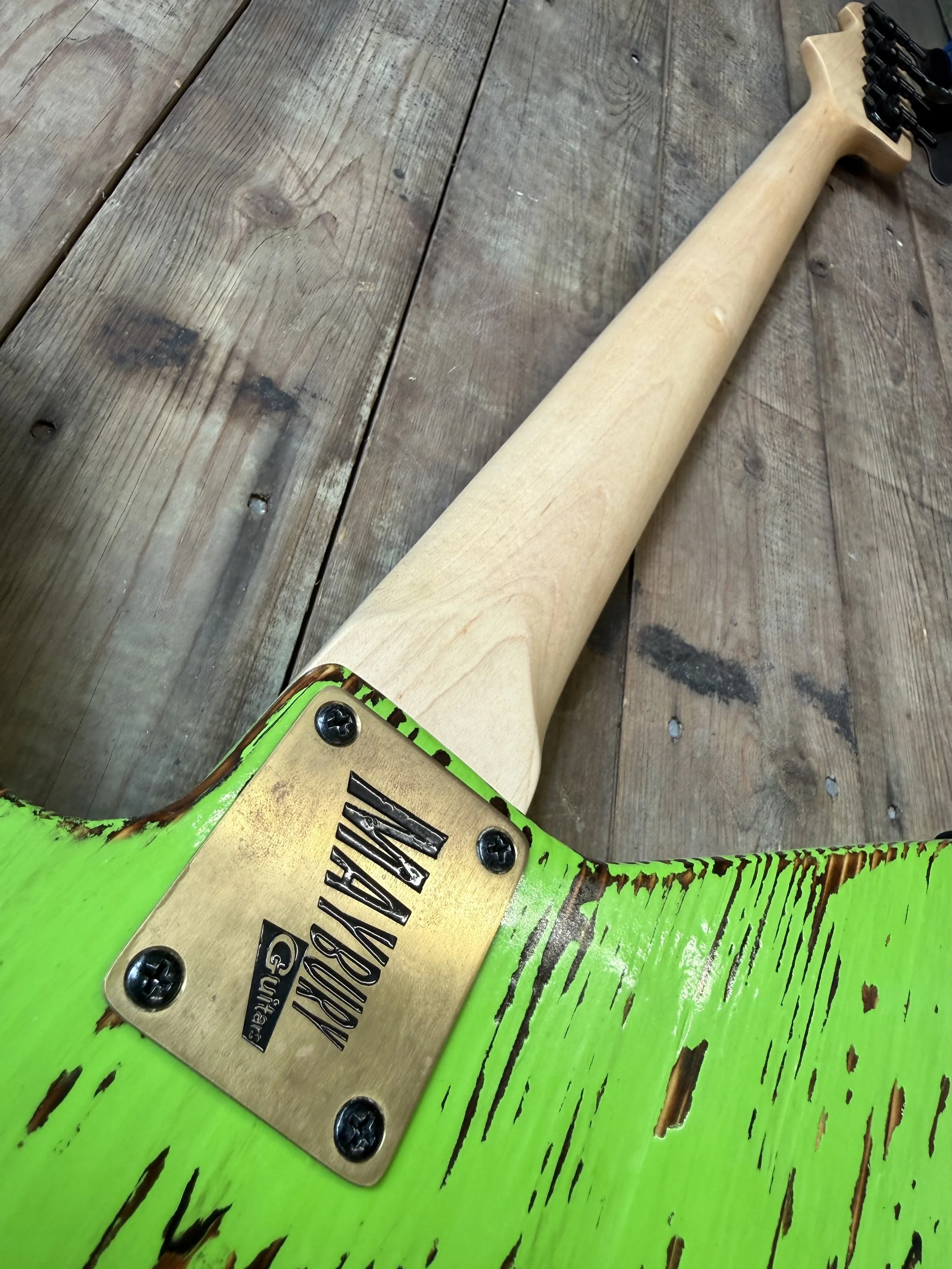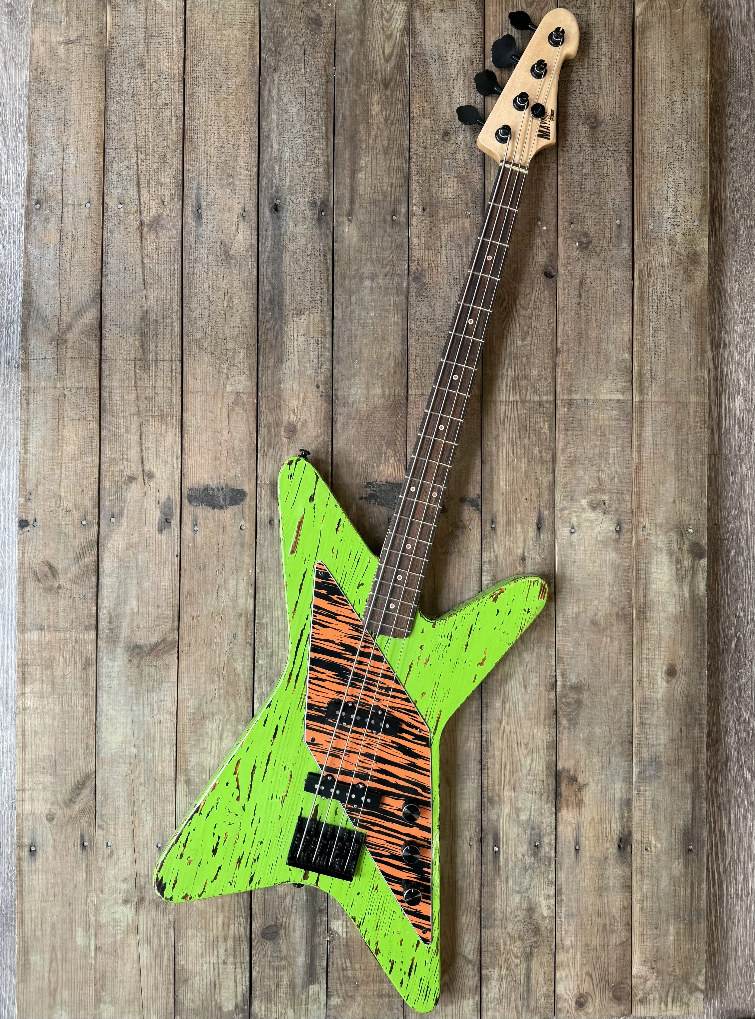 Its body is crafted from reclaimed spruce and finished in distressed Lime Green, sealed under a tough polyurethane clear coat. The bold finish is paired with a diamond‑shaped Tiger stipe pickguard, giving the instrument a striking edge that perfectly matches its attitude.